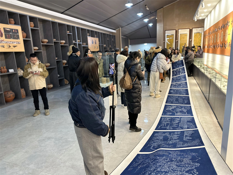 步入彩陶館,駱駝隊隊員們被仰韶文化的厚重底蘊深深吸引。在公司董事長暨三門峽市仰韶文化非遺傳承人王新軍的引領(lǐng)下,他們凝視著館藏彩陶上那些流轉(zhuǎn)千年的紋樣,手撫仿制陶器,驚嘆于七千年前仰韶先民已經(jīng)掌握礦物顏料繪制、高溫?zé)频木抗に嚕脖唤Y(jié)合三門峽特色非遺板藍根印染技藝的十米仰韶先民生活圖所震撼。